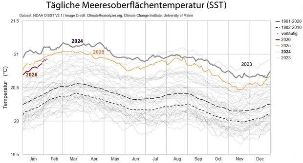 Wärmer als in allen früheren Jahren war allerdings im Jahr 2025 der tiefere Ozean bis zu 2000 m Tiefe. Gegenüber 2024 hat der Wärmegehalt des tieferen Ozeans im Jahr 2025 um 23 Zettajoule (1 Zettajoule=1021 Joule) zugenommen.[27] Das entspricht dem 39fachen der Wärmemenge, die die Menschheit durch ihre Energieproduktion in einem Jahr erzeugt. Zwei Drittel davon verbleiben in den oberen 700 m, der Rest gelangt in die tieferen Ozeanschichten von 700 bis 2000 m Tiefe. Der Wärmegehalt des Ozeans repräsentiert besser als die globale Oberflächentemperatur den Klimawandel, da 93% der zusätzlichen Erwärmung des Klimasystems durch menschliche Emissionen von Treibhausgasen vom Ozean aufgenommen werden.[28]
