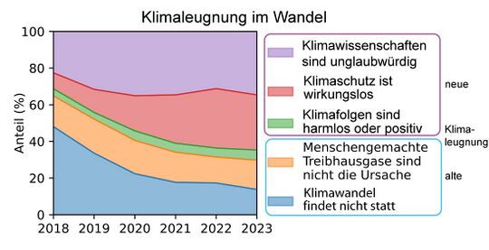 Nach einer US-amerikanischen Untersuchung von YouTube-Beiträgen hat sich zwischen 2018 und 2023 die Strategie der Klimaleugnung markant verändert. 2018 bestand die Klimaleugnung zu 65% aus Alter Leugnung, 2023 nur noch zu 30%. Dagegen hat die neue Form der Klimaleugnung im selben Zeitraum von 35% auf 70% zugenommen (Abb. 2). Damit wird deutlich, worum es den Klimaleugnern im Kern geht: die fossile Industrie zu retten und den Kampf gegen den Klimawandel zu unterminieren.[2]