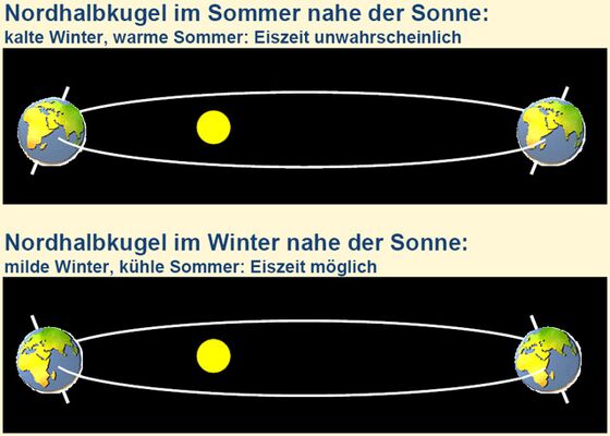 Besonders wenn sich die Erde relativ nah an der Sonne vorbeibewegt und ihre Achse sich im Sommer zur Sonne hinneigt, wird die Nordhalbkugel der Erde stärker erwärmt (Abb. 2). Eis- und Schneeflächen, die sich im Winter gebildet haben, können zu einem größeren Teil wieder abschmelzen. Die zusätzliche Sonneneinstrahlung reicht allerdings nicht, um eine Eiszeit zu beenden. Dazu muss es noch Verstärker im Klimasystem der Erde geben. Wenn das Eis beginnt, stärker abzuschmelzen, werden dunkle Flächen frei. Die Albedo wird geringer. Weniger Sonnenstrahlen werden zurück in den Weltraum reflektiert und erwärmen stattdessen die Erdoberfläche. Eine zweite solche Rückkopplung kommt durch das CO2 zustande. Die Sonnenstrahlen erwärmen auch den Ozean. Der gibt dadurch Kohlendioxid an die Atmosphäre ab, wodurch es wiederum wärmer wird usw. Die Eis- und die CO2-Rückkopplung tragen am Ende einer Eiszeit wesentlich mehr zur Erwärmung bei als die zusätzliche Sonneneinstrahlung.