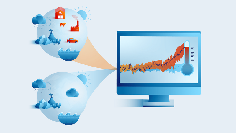 Modellberechnungen des aktuellen Temperaturtrends mit nur natürlichen (blau) und natürlichen und menschlichen (rot) Antrieben.