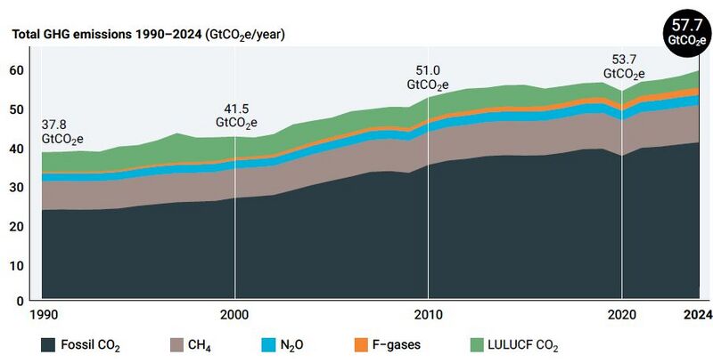 | aktuell | 19:39, 7. Nov. 2025 | 905 × 462 (35 KB) | Dieter Kasang (Diskussion | Beiträge) | == Beschreibung == Treibhausgasemissionen 1990-2024. F-gases = fluorierte Kohlenwasserstoffe, N<sub>2</sub>O = Distickstoffoxid, CH<sub>4</sub>= Methan, CO<sub>2</sub>-LULUCF = CO<sub>2</sub> aus Landnutzungsänderungen, CO<sub>2</sub>-FFI = fossile und industrielle CO<sub>2</sub>-Emissionen ==Lizenzhinweis== {| style="border:1px solid #8888aa; background-color:#f7f8ff;padding:5px;font-size:95%;" | Quelle: UNEP, United Nations Environment Programme (2025): Emissions Gap Report 2025: Off target –… |