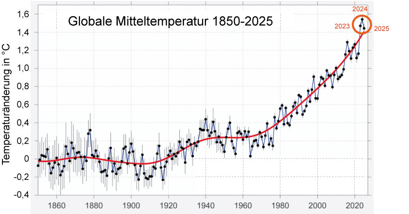 Globale Mitteltemperatur 1850-2025 nach Daten von Berkely Earth - verändert, übersetzt.