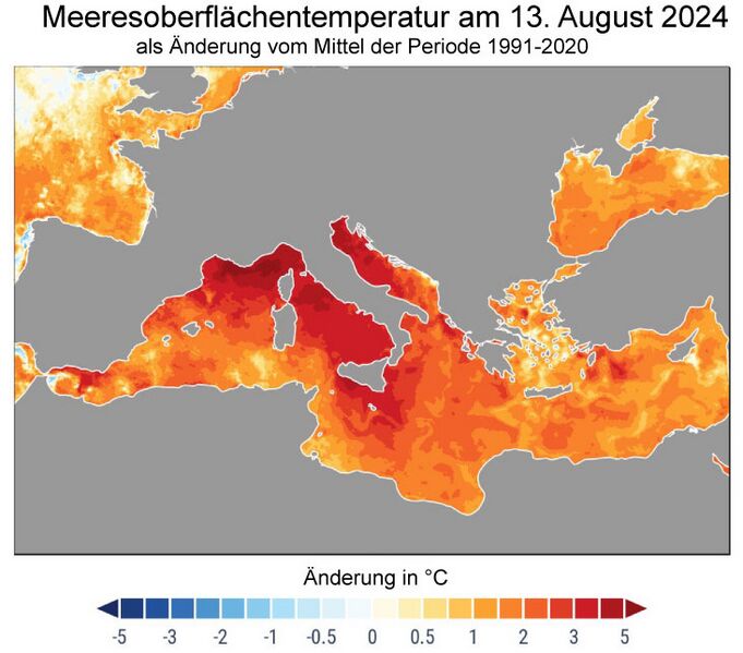 Meeresoberflächentemperatur am 13. August 2024 als Abweichung vom Mittel der Periode 1991-2020, übersetzt
