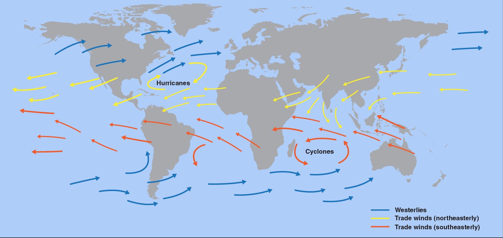 Wichtige Windsysteme auf der Erde: Passat- und Westwinde