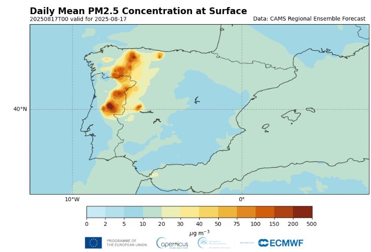 Verbreitung der Brände in Nordwest-Spanien und Nord-Portugal am 17.8.2025, gezeigt anhand von Feinstaubpartikeln.