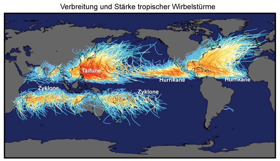 Zugbahnen und Stärke tropischer Wirbelstürme.