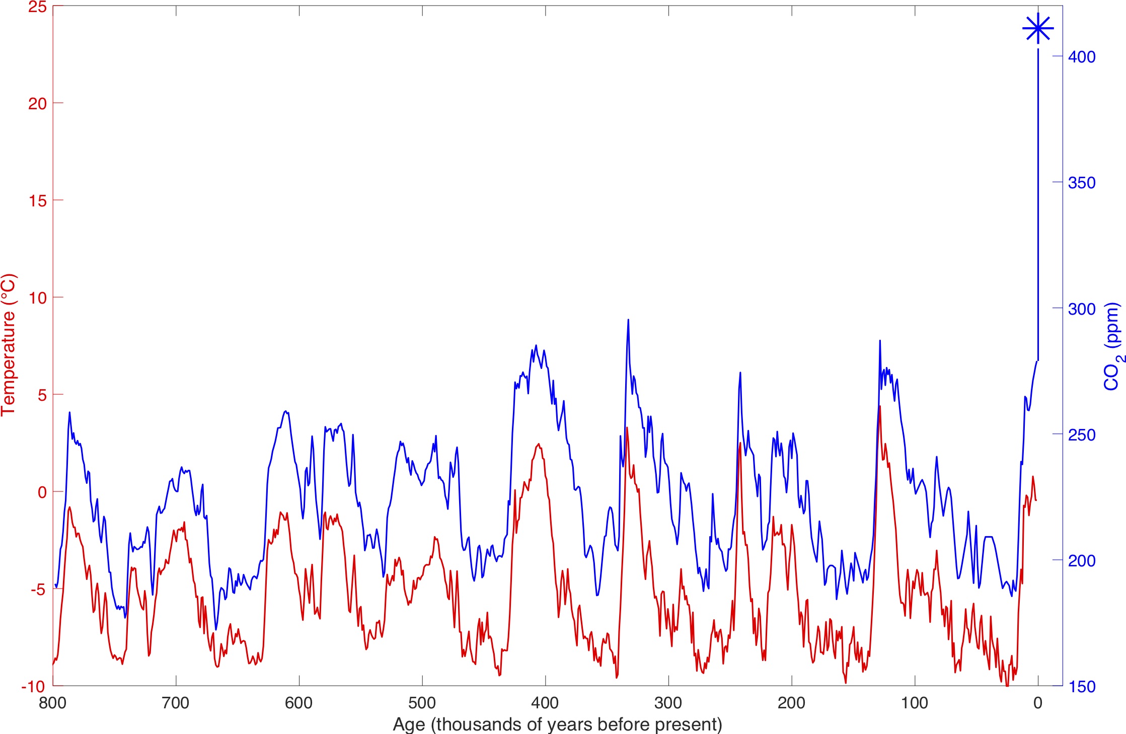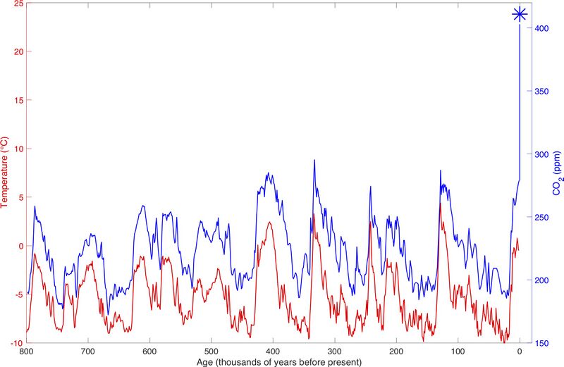Änderungen der Temperatur und der atmosphärischen CO2-Konzentration in den letzten 800 000 Jahren nach Daten von Eisbohrkernen aus der Ost-Antarktis. CO2 in ppm und Temperatur als Abweichung vom Mittel der Periode.