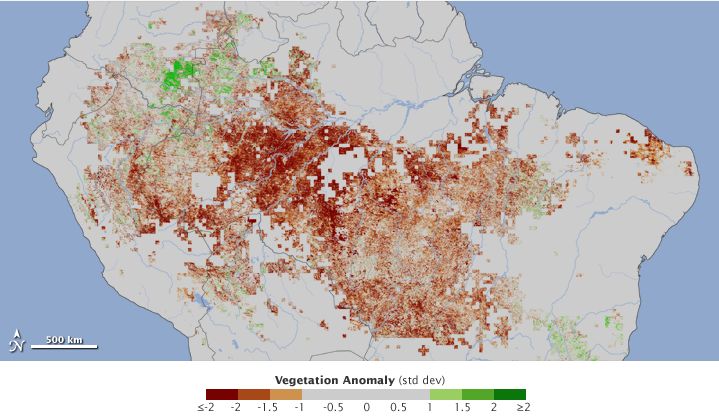 Dürre Amazonas 2010: Die Vegetationskarte zeigt das weit verbreitete Braunwerden des Amazonas-Regenwaldes