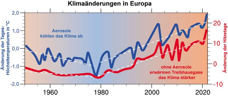 Aerosole sind jedoch schädlich für die menschliche Gesundheit und wurden für das Waldsterben verantwortlich gemacht. Daher begann man in den 1970er Jahren, sie aus den Abgasen herauszufiltern. Das Ergebnis war: Die Erwärmung durch Treibhausgase machte sich um so stärker bemerkbar. Europa wurde zu einem Hotspot von Hitzewellen. Die Zunahme von Hitzetagen und hohen Sommertemperaturen ist fast dreimal so hoch wie im globalen Mittel. So gab es in Europa 2003, 2010, 2015, 2018, 2019 und 2022[2], aber auch in den Folgejahren extreme Hitzewellen, begleitet von Waldbränden, Ernteausfällen und zahlreichen Todesopfern.