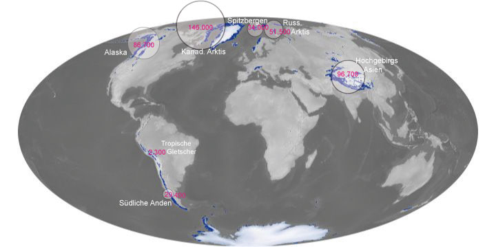 Gletscher gibt es fast überall auf der Welt, wo es kalt genug ist, dass der im Winter gefallene Schnee im Sommer liegen bleibt. Wenn in den folgenden Wintern wieder Schnee fällt, entsteht daraus durch den Druck von immer mehr Schnee neues Eis. Solche Klimaverhältnisse finden sich nicht nur in hohen Breiten in der Nähe der Pole, sondern auch weiter weg von den Polen in hohen Gebirgen (Abb. 1). Ja, sogar in den Tropen gibt es in Höhen von vier- oder fünftausend Metern einige Gletscher. So z.B. in den Anden in der Cordillera Blanca und auf dem Kilimandscharo, dem höchsten Berg Afrikas, in über 5000 m Höhe - noch. Die größten Gletschergebiete liegen in der kanadischen Arktis, in Alaska und Hochgebirgs-Asien.
