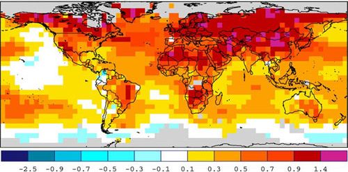 Für ein Verständnis der vom Menschen verursachten Modernen Warmzeit ist es hilfreich, sie auf dem Hintergrund der Klimaschwankungen in den letzten 1000 Jahren und davor zu sehen. Über einen längeren Zeitraum von 2000 Jahren und global betrachtet (Abb. 2), zeigt sich, dass die Mittelalterliche Warmzeit überhaupt nicht als solche hervortritt, sondern Teil eines langen Abkühlungstrends ist.[2] Sie ist lediglich eine wärmere Phase gegenüber der darauf folgenden Kleinen Eiszeit. Wärmer als in anderen Gebieten war es zwischen dem 10. und 13. Jahrhundert vor allem in der Nordatlantik-Region, während es in den meisten Regionen der Welt deutlich kühler als im späten 20. Jahrhundert war (Abb. 3). So wurde während der Mittelalterlichen Warmzeit Südgrönland besiedelt und im Norden Schottlands und Skandinaviens wurde der Getreideanbau möglich.[3] Völlig anders vollzog sich dagegen die moderne Erwärmung durch den Menschen zu Beginn des 21. Jahrhunderts. Sie zeigte sich fast überall auf der Erde (Abb. 4) und erreichte mit ca. 0,5 °C in zwei Jahrzehnten Werte, für die die Natur in der starken Erwärmungsphase nach der letzten Eiszeit ca. 1000 Jahre gebraucht hat.[4]