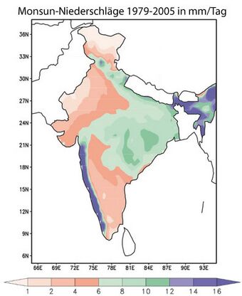 Der Indische Monsun, der häufig auch als Südasiatischer Monsun bezeichnet wird, ist Teil des globalen Monsunsystems. Das Monsunsystem bestimmt das Klima großer Teile der in den Tropen und Subtropen liegenden Kontinente. Die Monsungebiete der Erde sind durch jahreszeitlich wechselnde Winde und hohe saisonale Niederschläge gekennzeichnet, die mit Trockenzeiten abwechseln. In ihnen leben 62% der Weltbevölkerung, und die Bevölkerungsdichte ist in der Regel sehr hoch, vor allem in Süd- und Ostasien mit den beiden bevölkerungsreichsten Ländern der Erde Indien und China.[1] Die Landwirtschaft in den Monsunregionen sowie die Lebens- und Ernährungsbedingungen sind in hohem Maße von den sommerlichen Monsun-Niederschlägen abhängig.