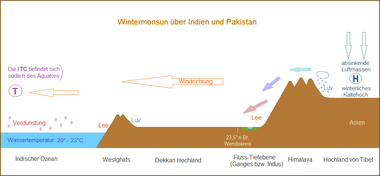 Der Monsun ist eine Reaktion des Klimasystems auf die jährliche Schwankung der Solarstrahlung mit jahreszeitlich wechselnden Winden und Niederschlägen, wobei der Einfluss des Temperatur- und Luftdruckgegensatzes zwischen Land und Meer eine entscheidende Rolle spielt. Ein typisches Merkmal des Monsunklimas ist der Kontrast zwischen niederschlagsreichem Sommer und trockenem Winter (Abb. 3 und 4). Die südasiatische Landmasse erwärmt sich im Frühling und Sommer stärker als die umgebenden Wasserkörper, wodurch es zu einem deutlichen Temperaturunterschied zwischen Land und Ozean kommt. Diese Erwärmung bewirkt die Entwicklung von Tiefdruckgebieten über Nordindien. Hinzu kommt, dass die Erwärmung des Himalayas und des Hochlands von Tibet eine grundlegende Temperaturdifferenz zwischen der Erdoberfläche und der Troposphäre hervorruft, die für die Intensivierung des Monsuns entscheidend ist. Die Folge sind günstige thermodynamische Bedingungen, die aufsteigende Luftmassen bzw. Konvektion nördlich des Äquators begünstigen.[5] Die jahreszeitliche Änderung der Monsunwinde über Indien fällt mit der Migration der Innertropischen Konvergenzzone ITZC zusammen, die im Sommer über Nordindien und im Winter südlich des Äquators liegt.