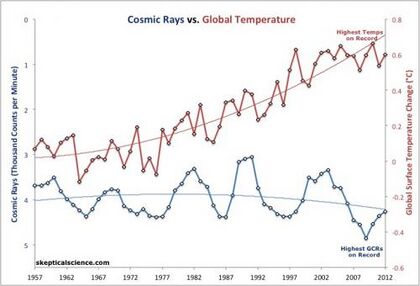Die kosmische Strahlung hat seit ca. 1990 zugenommen (Abb. 1 - die umgedrehte Skala beachten!). Es müssten sich demnach mehr Wolken bilden, wodurch es kühler und nicht wie beobachtet wärmer werden müsste. Über den längeren Zeitraum seit 1950 hat sich die kosmische Strahlung kaum geändert. Experimente am Schweizer Kernforschungszentrum CERN und weitere Studien konnten zudem keinen Zusammenhang zwischen kosmischer Strahlung und der Bildung von Wolken nachweisen. Die kosmische Strahlung hängt außerdem eng mit der Sonnenaktivität zusammen, so dass es schwer fällt, den Einfluss der kosmischen Strahlung von dem der Sonne zu unterscheiden.[2]