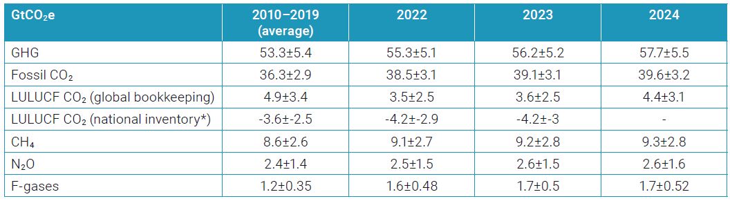 Tab. 1: Treibhausgasemissionen 2010-2019, 2022, 2023 und 2024 in Gt CO2-Äquivalent