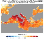 11:35, 23. Nov. 2025 Mittelmeer-SST-13.8.24dt.jpg (Datei) 84 KB Dieter Kasang (Diskussion | Beiträge) == Beschreibung == Meeresoberflächentemperatur am 13. August 2024 als Abweichung vom Mittel der Periode 1991-2020, übersetzt ==Lizenzhinweis== {| style="border:1px solid #8888aa; background-color:#f7f8ff;padding:5px;font-size:95%;" | Quelle: Copernicus Climate Change Service (C3S) and World Meteorological Organization (WMO), 2025: European State of the Climate 2024, https://climate.copernicus.eu/esotc/2024 <br> Lizenz: Short extracts from this publication may be reproduced without authorisatio… 1