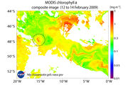 | 22:21, 14. Jan. 2014 | Satellit Blüte.jpg (Datei) | 2,48 MB | Satellitenaufnahme der Chlorophyllkonzentrationen an der Meeresoberfläche während der Lohafex-Studie (eingekreist). Oben rechts ist die natürliche Algenblüte deutlich größer; auch im Südosten sind erhöhte Werte zu beobachten. Grafik: NASA (htt… | 1 | |