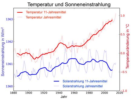 Die Sonneneinstrahlung schwankt alle 11 Jahre auf und ab, wie Wellen auf einer Wasseroberfläche; diese Schwankungen werden als Schwabe-Zyklen bezeichnet (Abb. 2). Befindet sich die Sonne in einem Wellental, gibt sie weniger Wärme an die Erde ab, auf einem Berg erwärmt sie die Erde stärker. Der Unterschied ist nicht besonders groß und beträgt etwa 1 W/m2. Über einen längeren Zeitraum heben sich die Unterschiede auf. Über die Wellenberge und -täler hinweg kann die Sonnenstrahlung aber auch über einige Jahrzehnte hintereinander zunehmen. Das war z.B. zwischen 1900 und 1960 der Fall und hat zu einer leichten Erwärmung der Erde geführt. Danach ist jedoch das Umgekehrte eingetreten: Die Strahlung der Sonne nimmt über alle Schwankungen hinweg bis heute ab (Abb. 2). Über die letzten 100 Jahre hat die Sonne laut Weltklimarat IPCC weniger als 0, 1 W/m2 zur Erwärmung der Atmosphäre beigetragen.[1] Das ist im Verhältnis zur Erwärmung durch das vom Menschen emittierte Kohlendioxid um 2,25 W/m2 zu sehen (vgl. Treibhausgase, Abb. 2).