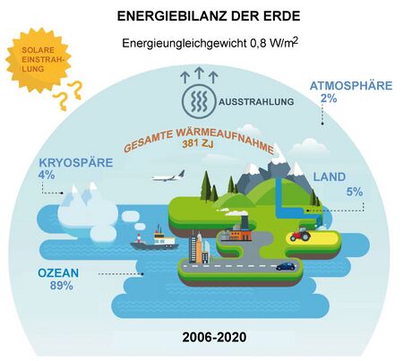 | [[Bild:Energiebilanz-2006-2020.jpg|thumb|460px|Abb. 7: Energiebilanz der Erde und die Aufteilung der zusätzlichen Erwärmung auf Atmosphäre (2%), Kryospäre (4 %), Land (5%) und Ozean (89%) für 2006-2020 (1971-2020 in Klammern) in Zeta Joule (1 ZJ = 10<sup>21</sup> J)]] | |||