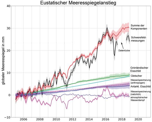 Der nachfolgende starke Anstieg des Meeresspiegels ist vor allem auf das Abschmelzen Grönlands zurückzuführen, dessen Rate sich nach 2010 nahezu verdoppelt hat, und zwar vor allem durch den Eisverlust an der Südwestküste Grönlands. Hinzu kam ein starker Massenverlust des auf dem Land gespeicherten Wassers ab Mitte 2012. Seit 2013 stoppte jedoch der gewaltige Massenverlust des grönländischen Eises. Die Eisschmelze auf der Antarktis nahm dagegen seit 2013 deutlich zu.[20]