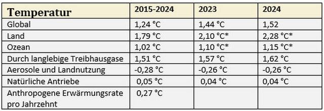 Der letzte IPCC-Bericht AR6 (2021)[1] definiert die globale Erwärmung durch den Menschen als die Differenz zwischen der Mitteltemperatur der jeweils letzten 10-Jahresperiode im Vergleich zu der als vorindustriell definierten Periode 1850-1900. Im AR6 ist die letzte 10-Jahresperiode 2010-2019 und der Temperaturanstieg gegenüber vorindustriell beträgt 1,06 °C. In der Aktualisierung von Forster et al. (2025)[2] ist es die Dekade 2015-2024. Hiernach hat sich die globale Mitteltemperatur 2015-2024 gegenüber 1850-1900 um 1,24 °C erhöht. Die Mitteltemperatur über dem Land ist um 1,79 °C und die über dem Ozean um 1,02 °C gestiegen. Herausragend sind dabei die Jahre 2023 und 2024 mit einer Temperaturzunahme um 1,44 °C bzw. 1,52 °C gegenüber vorindustriell.