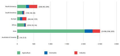 Die Wasserentnahme betrug 2017 etwa 3.800 km3/Jahr, was bezogen auf die zur Verfügung stehenden erneuerbaren Ressourcen in Flüssen, Seen, oberflächennahem Grundwasser und Niederschlägen nur 10% ausmacht. Der globale Mittelwert verdeckt jedoch, dass z.B. 2010 über ein Drittel der Weltbevölkerung mindestens über einen Monat unter Wasserstress zu leiden hatte. 80% davon lebten in Asien, vor allem im Nordosten Chinas sowie in Indien und Pakistan. Subsahara-Afrika und Mittelasien haben besonders unter ökonomisch bedingtem Wassermangel in der Landwirtschaft zu leiden, der durch eine unterentwickelte Infrastruktur und fehlende ökonomische Kapazitäten bedingt ist.[2]
