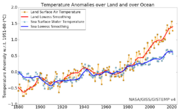 | 10:44, 17. Nov. 2022 | Land Ocean temp1880-2021.png (Datei) | 133 KB | Dieter Kasang (Diskussion | Beiträge) | Veränderung der globalen Oberflächentemperatur über dem Land (rot) und der Meeresoberflächentemperatur (blau) 1880-2021 im Vergleich zur Basis 1951-1980. ==Lizenzhinweis== {| style="border:1px solid #8888aa; background-color:#f7f8ff;padding:5px;font-size:95%;" | Quelle: NASA (2022): [https://data.giss.nasa.gov/gistemp/graphs_v4/ GISS Surface Temperature Analysis (v4)] <br> Lizenz: public domain |} | 1 | |