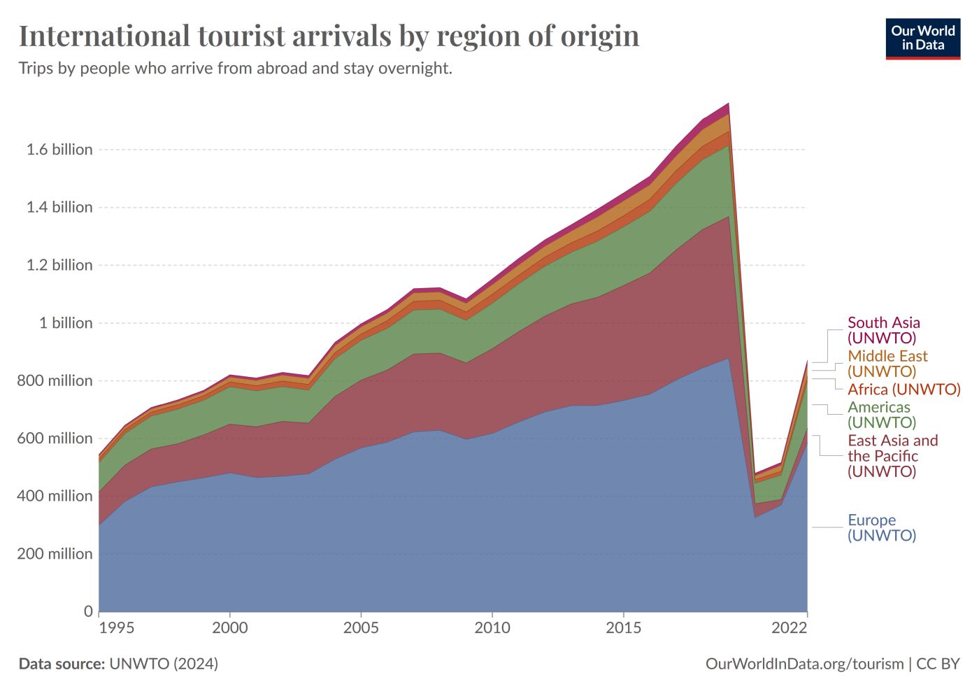 | 14:43, 11. Sep. 2024 | International-tourist-arrivals-by-region.jpg (Datei) | 90 KB | Dieter Kasang (Diskussion | Beiträge) | == Beschreibung == Internationale Touristenankünfte nach Herkunftsregionen 1995-2022 ==Lizenzhinweis== {| style="border:1px solid #8888aa; background-color:#f7f8ff;padding:5px;font-size:95%;" | Quelle: Herre, B., & V. Samborska (2024): Tourism, OurWorldInData.org. International tourist arrivals by region of origin, https://ourworldindata.org/tourism Lizenz: CC BY https://creativecommons.org/licenses/by/4.0/ |} | 1 | |