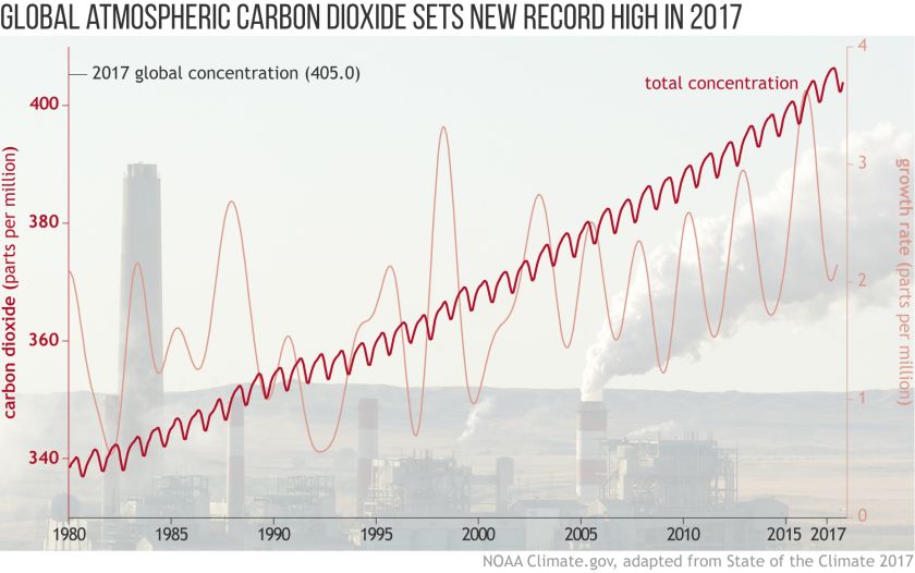 CO2-Konzentration 1980-2017 und Wachstumsrate
