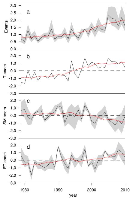 Änderung von Blitz-Dürren und deren Begleiterscheinungen in China 1979-2010 während der Wachstumszeit (April-September): a: Anzahl von Blitz-Dürren pro Jahr, b: Temperaturänderungen, c: Änderung der Bodenfeuchte, d: Änderung der Verdunstung; b-d: in Standardabweichungen.