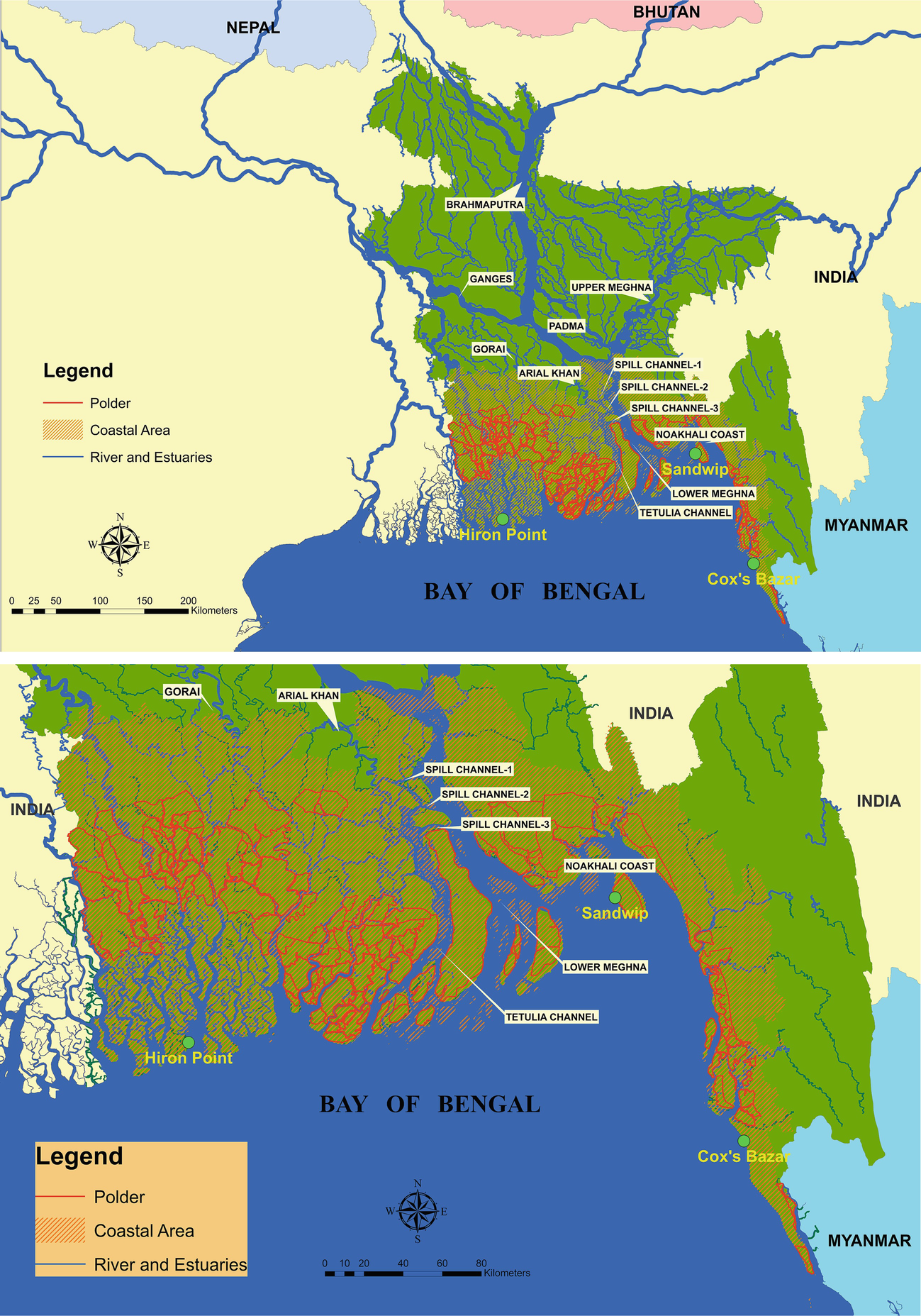 Flusssystem (oben) und Küstenzone (unten) in Bangladesch. Grüne Punkte: Pegelmessstationen.