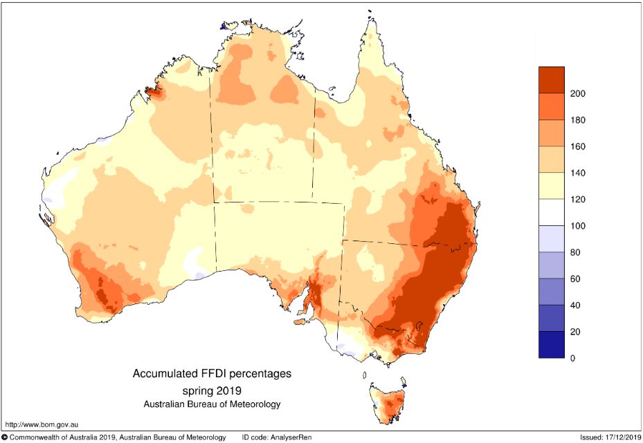 Über alle Tage im Frühjahr 2019 akkumulierter Feuer-Gefahren-Index (FFDI) in % zum langjährigen Mittel 1950-2018.