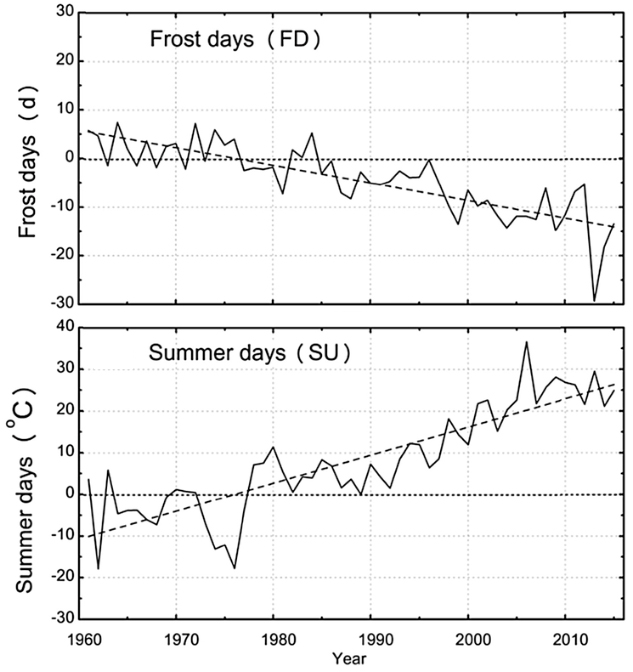 Änderung der Frost- und Sommertage in der Hindukusch-Himalaya-Region 1961-2014 in °C
