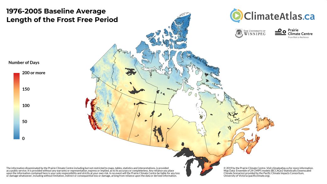 | aktuell | 19:21, 29. Okt. 2020 | 1.040 × 585 (87 KB) | Dieter Kasang (Diskussion | Beiträge) | Mittlere jährliche frostfreie Periode in Kanada über den Zeitraum 1976-2005 ==Lizenzhinweis== {| style="border:1px solid #8888aa; background-color:#f7f8ff;padding:5px;font-size:95%;" | Quelle: Climate Atlas of Canada (2019): [https://climateatlas.ca/… |