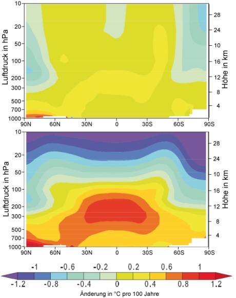 Modellsimulation der Temperaturveränderung 1890-1999 in °C pro Jahrhundert durch solaren Antrieb (oben) und durch den Antrieb langlebiger Treibhausgase (Kohlendioxid, Methan, Distickstoffoxid, FCKW)
