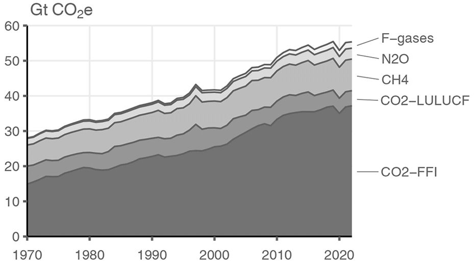 Treibhausgasemissionen 1970 bis 2022. F-gases = fluorierte Kohlenwasserstoffe, N2O = Distickstoffoxid, CH4= Methan, CO2-LULUCF = CO2 aus Landnutzungsänderungen, CO2-FFI = fossile und industrielle CO2-Emissionen
