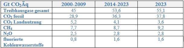 Mittlere Treibhausgasemissionen 2000-2009, 2014-2023 und 2023 in Gt CO2-Äquivalent
