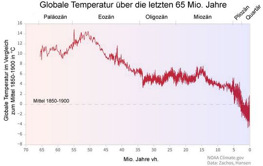 Daraus lässt sich aber nicht ableiten, dass die heutige Erwärmung durch ähnliche Vorgänge bedingt ist. Zwar spielt auch heute der CO2-Gehalt der Atmosphäre eine entscheidende Rolle, wenn auch in umgekehrter Richtung als Zu- und nicht als Abnahme. Seine heutige Veränderung kann jedoch nicht auf natürliche Prozesse wie Gebirgsbildung und Vulkanismus zurückgeführt werden, sondern ist durch das Verbrennen fossiler Energieträger wie Kohle, Öl und Gas durch den Menschen verursacht. Die aktuelle CO2-Zunahme und die damit verbundene Erwärmung läuft zudem in einem wesentlich schnelleren Tempo ab, als es in der Natur üblich ist. 1000 ppm könnten im schlimmsten Fall bereits im Jahr 2100 erreicht werden und damit in 250 Jahren, wozu die Natur 60 Mio. Jahre gebraucht hat.