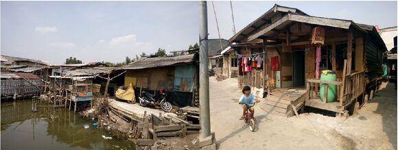 Im Gegensatz zu Tokio und Shanghai hat die indonesische Hauptstadt Djakarta auch aktuell noch mit erheblichen Überschwemmungen durch Meeresspiegelanstieg und Bodenabsenkungen zu kämpfen. Hier führten die Subsidenz und eine starke Bevölkerungszunahme zwar erst in den frühen 2000er Jahren zu größeren Hochwasserproblemen. Bis 2050 könnten jedoch 110 km2 des Stadtgebietes davon betroffen sein, zu 88% durch Absenkung des Untergrunds und nur in zweiter Linie durch den Meeresspiegelanstieg (Abb. 7). Als Reaktion auf Überschwemmungen in den 2000er Jahren haben die Bewohner der betroffenen Stadtgebiete das Niveau ihrer Häuser angehoben und Dämme aus Steinen und Holz errichtet, um ihre Wohngebiete vor Hochwasser zu schützen (Abb. 6). Die Regierung reagierte in jüngster Zeit mit einem Masterplan zum Schutz der Hauptstadt, dessen Umsetzung jedoch weder vorankommt noch für künftige Hochwasserniveaus ausreichend sein wird. So beschloss die Regierung dann 2019, die Hauptstadt auf die Insel Borneo zu verlegen.[7][14]