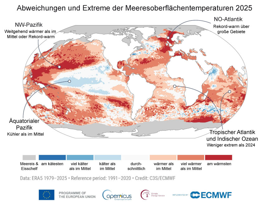 | 17:39, 7. Feb. 2026 | SST-2025-regional-dt.jpg (Datei) | 128 KB | == Beschreibung == Abweichungen und Extreme der Meeresoberflächentemperaturen für 2025. Die Abweichungen (kühler, wärmer) beziehen sich auf die Referenzperiode 1991-2020, die Extreme (kälteste, wärmste) auf 1979-2025). Verändert, übersetzt. == Lizenzhinweis == {| style="border:1px solid #8888aa; background-color:#f7f8ff;padding:5px;font-size:95%;" | Quelle: Copernicus Climate Change (2026): Global Climate Highlights 2025, graphics gallery, https://climate.copernicus.eu/GCH2025-graphics-gallery… | 1 | |