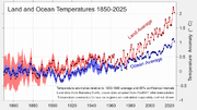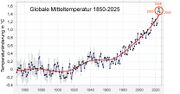 | 09:32, 5. Feb. 2026 | Globale temp1850-2025.png (Datei) | 332 KB | == Beschreibung == Globale Jahresmitteltemperatur 1850-2025, relativ zum Mittel 1850-1900 (vorindustriell). Vertikale Linien zeigen Unsicherheitsbereiche an. == Lizenzhinweis == {| style="border:1px solid #8888aa; background-color:#f7f8ff;padding:5px;font-size:95%;" | Quelle: Rohde, R. (2026): [https://berkeleyearth.org/global-temperature-report-for-2025/ Global Temperature Report for 2025]<br> Lizenz: [https://creativecommons.org/licenses/by-nc/4.0/ CC BY-NC 4.0] |} | 1 | |